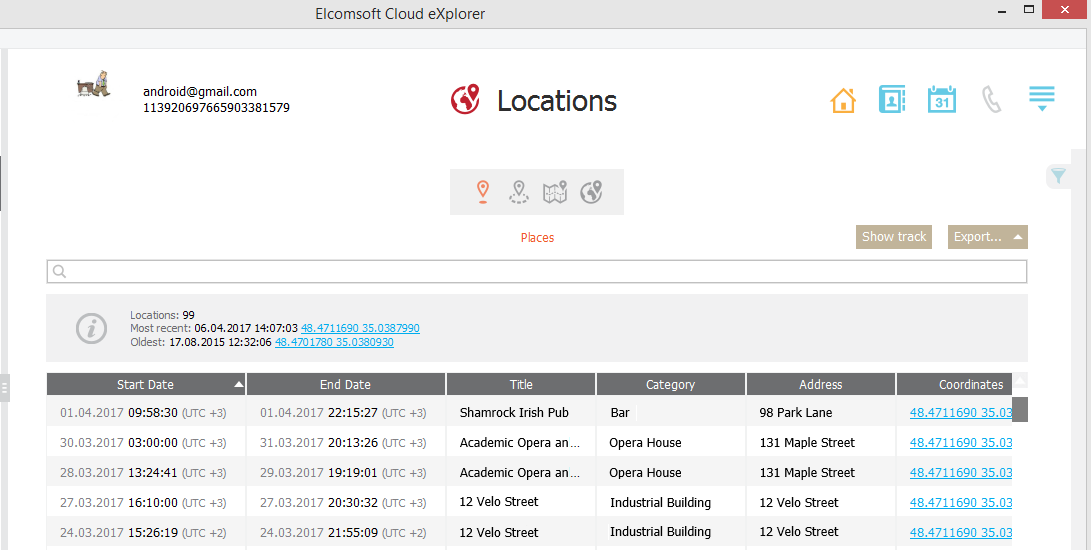 The Locations plugin includes the following sections: •Places: Information on the user's location history. •Routes: Detailed information on the user's location history including all parts of the route. •Your Places: Information on locations that the user attended or manually labeled on Google maps. •Maps: Information on user's saved Google maps.