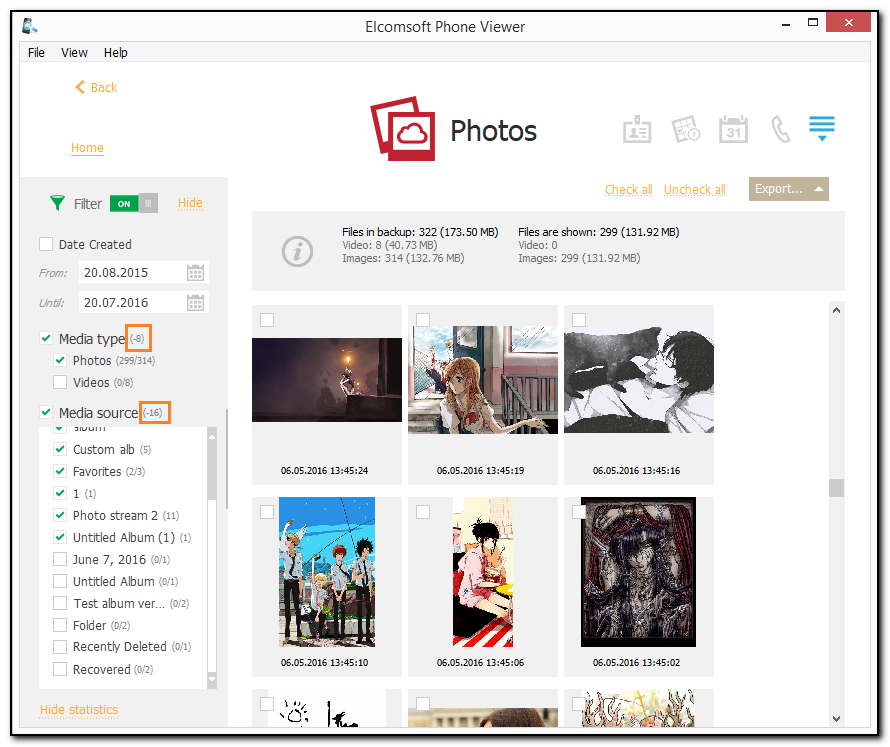 To export media files, check them and click Export. It is possible to export checked media files, filtered files or all files.